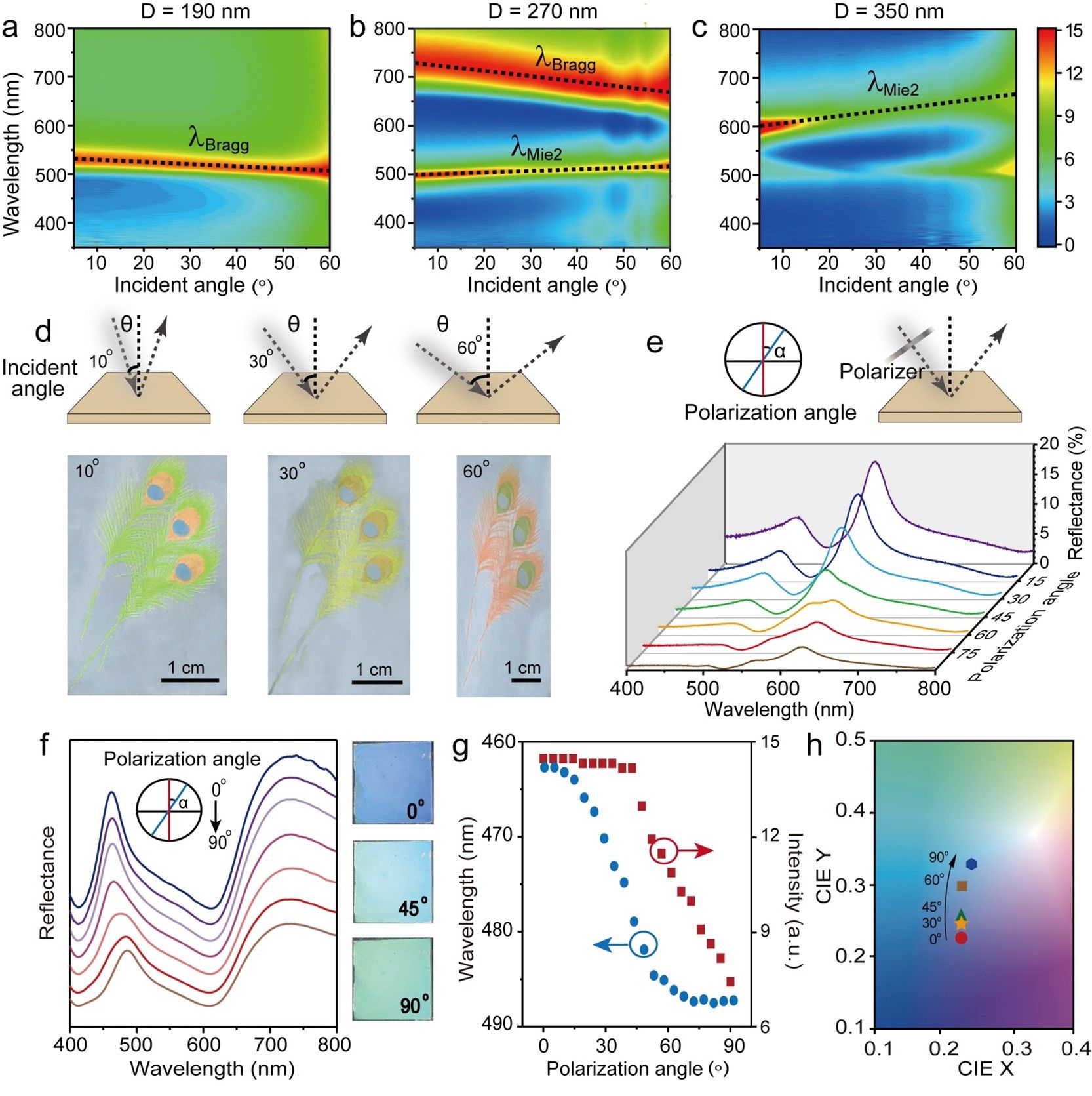 最后,作者展示了双共振机制驱动的角度/偏振响应与实际应用。入射角实验揭示差异化行为:当角度从5°增至60°,所有尺寸CdS球的布拉格峰蓝移,而米氏散射峰红移且强度剧降,该现象源于周期性耦合增强米氏共振的前向散射。偏振实验表明:s偏振可高效激发磁偶极环流,而p偏振使CdS米氏峰红移15 nm且强度衰减60%;ZnS晶格在CIE色度图中沿y轴偏移,实现偏振控色。基于此开发的喷墨打印技术,用CdS/ZnS墨水制成8 cm²孔雀图案——视角60°时中心区从橙红变为绿色(米氏散射蓝移主导),边缘区从亮黄变为橙色(布拉格调制),验证双机制动态显色能力。