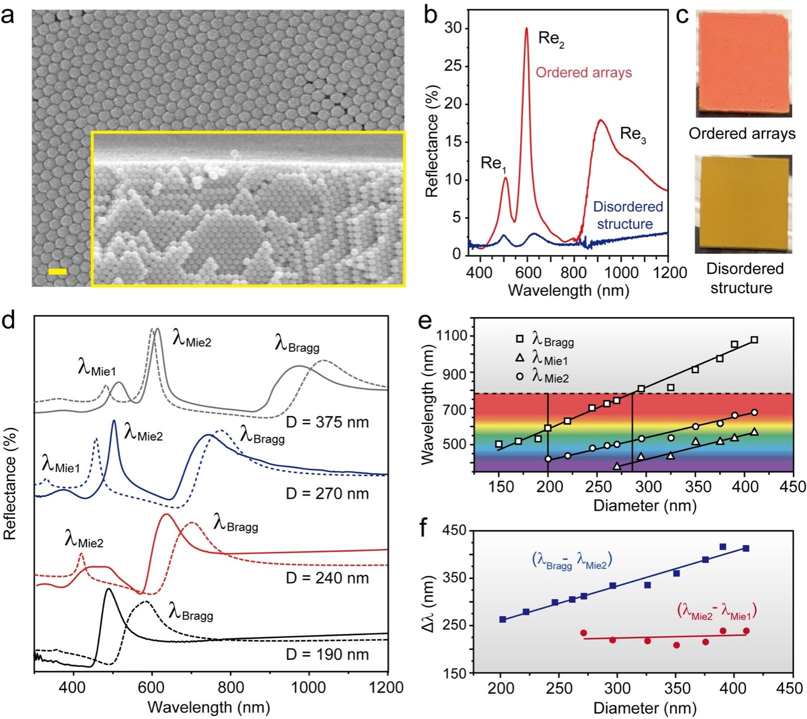 三维光子晶体通过周期性介电结构调控局域态密度(LDOS),在布拉格带隙作用下产生不褪色的结构色,在光学传感、发光调制、微纳光学等领域广泛应用。然而,传统自组装光子晶体中的序构基元(如SiO₂或聚苯乙烯)折射率较低(n < 1.7),难以支持强米氏共振(Mie resonance),尤其缺乏可见光波段的高效磁偶极共振。另一方面,虽然高折射率材料(如硅、锗等,n ≥ 3.5)能产生显著的磁偶极米氏共振并用于超构材料设计,但其在可见光区存在严重的吸收损耗,且难以通过自组装实现高效、低成本的大面积有序排列。因此,在可见光波段实现高Q值米氏共振耦合效应,并兼顾低成本、大面积的制备,成为关键挑战。