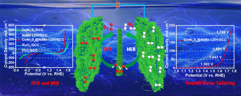(2)接着,梁长海教授团队发现Ni-Co双金属硫化物已经表现出优异的析氢性能,但是其在析氧阳极电势下会被氧化而使硫原子从催化剂中脱除,最终造成催化剂的不稳定。LDH是一类高活性和稳定性的析氧催化剂,但是其弱导电性会限制其活性。因此,将LDH整合到硫化物的表面获得具有核壳异质结构的复合物,能同时利用Ni-Co硫化物的高导电性和LDH的高稳定性补偿各自的缺点,并且还能获得高活性。尽管NiFe LDH已经被广泛地用于析氧反应,但是为了获得更高的析氧活性,NiMn LDH可能是一种好的替代品。这是因为有研究报道了Mn可以通过调节FeOOH的电子结构,极大地增强其析氧本征活性。另外,梁长海教授团队通过调研文献发现NiMn LDH极少地被用于析氧反应,认为它可能是一种优异的析氧催化剂。除此之外,电极与作为反应物的电解液能够有效地接触,可以加速质量传递,提高催化活性。基于此,结合以上的策略,具有分级结构的CoNi2S4@NiMn LDH异质结构纳米线阵列被负载在超亲水碳布上。CoNi2S4@NiMn LDH异质结构不仅结合了核CoNi2S4和壳NiMn LDH的优异本征活性,还补偿了它们各自的缺点,增强了导电性和稳定性。该催化剂对于析氢、析氧和全水分解反应都表现出了优异的活性与稳定性。例如,它被同时作为阴极和阳极用于全水分解反应时,获得10、50、100和200 mA cm–2的电流密度仅分别需要1.502、1.642、1.691和1.748 V的池电压。这样的高活性优于目前大多数的非贵金属催化剂。相关工作发表在Electrochimica Acta (),题目为“Hierarchical CoNi2S4@NiMn-layered double hydroxide heterostructure nanoarrays on superhydrophilic carbon cloth for enhanced overall water splitting”。