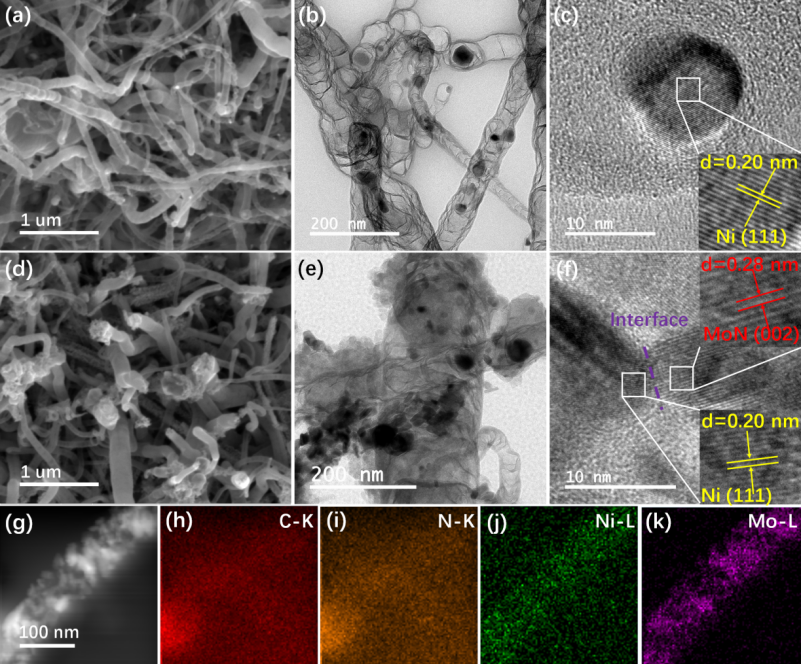 (1)近期,梁长海教授团队发现氮化钼由于具有类似第VIII副族贵金属的催化特性已经被广泛地用作析氢催化剂。可是,提高氮化钼的催化活性和稳定性依然存在着挑战。一种有效的解决方式是将氮化钼与其它的功能化材料进行复合而提高其催化性能。Ni基材料是一种有效的析氧催化剂。将氮化钼与Ni基材料进行复合,可能会提高催化剂的析氢活性,反过来也可能会增强催化剂的析氧活性,最终得到一种高效的双功能催化剂。另外,纳米催化剂在稳定性测试的过程中容易聚集而降低催化活性,但是将其锚定或封装在碳材料中能够有效地解决这个难题。基于此,梁长海教授团队报道了一种新的合成方法在碳布表面生长封装有Ni/MoN异质结构的掺氮碳纳米管(Ni/MoN@NCNT/CC)。物理表征和电化学测试结果表明了梁长海教授团队得到了所需的催化剂,并且该催化剂表现出了优异的析氢、析氧和全水分解性能。这部分工作提供了一种新的策略去构建大表面积的三维异质结构的水分解催化剂。相关工作发表在ChemElectroChem 2020, 7, 745-752 (),题目为“N-doped Carbon Nanotubes Encapsulating Ni/MoN Heterostructures Grown on Carbon Cloth for Overall Water Splitting”。
