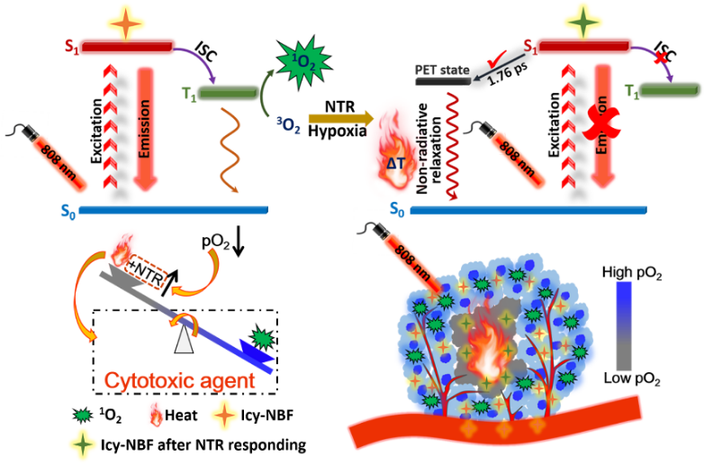 精细化工国家重点实验室樊江莉教授团队提出了一种新颖的策略,开发了一例基于氧气含量调节激发态失活过程的近红外光敏剂(Icy-NBF)。肿瘤氧气含量的降低会诱导细胞内硝基还原酶的表达增多,Icy-NBF会与硝基还原酶(NTR)发生特异性响应,含芳硝基的基团经还原后脱除,得到分子Icy-NH2(整个过程如图1所示)。在整个催化还原过程中,光敏剂的激发态失活过程也发生了变化。对于光敏剂(Icy-NBF),在808 nm光照射下,激发态失活过程为辐射跃迁和与氧气的能量转移。对于Icy-NH2,激发态失活过程主要归因于光诱导电子转移引起的非辐射弛豫。由此,光敏剂Icy-NBF可以在肿瘤有氧处进行氧气敏化产生的单线态氧进行光动力治疗,也可在乏氧处转化为Icy-NH2,对乏氧肿瘤进行不需要氧气的光热治疗。与FDA批准的临床光敏剂ICG相比,Icy-NBF从氧气敏化和光热转换两方面均提高了对光子的利用。在细胞光疗评估中对有氧和乏氧癌细胞均表现出优异的抗癌效果,并最终在肿瘤活体治疗中,将肿瘤完全抑制甚至消除。这项研究为未来开发高效光子利用的光疗用光敏剂提供了具有指导性的分子设计策略。