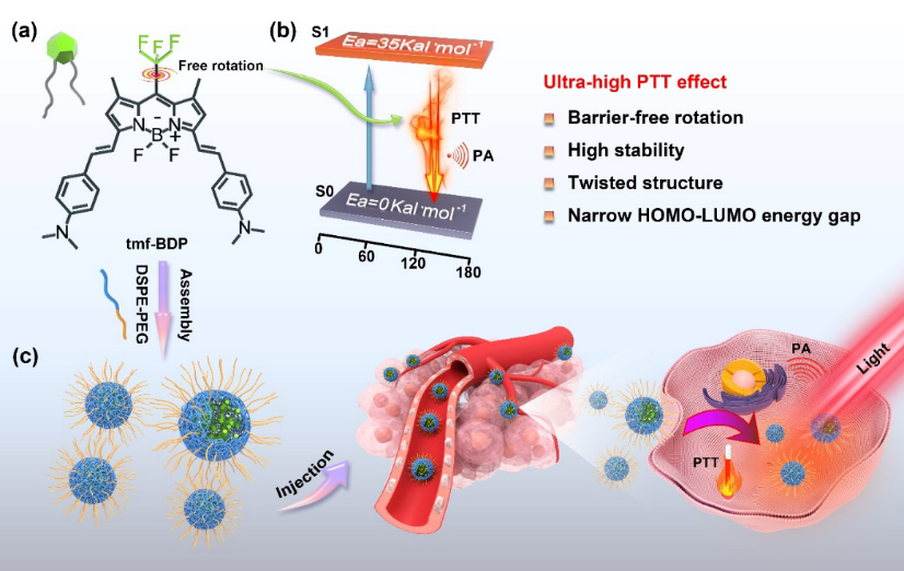 光热疗法(PTT)是具有高选择性和低毒副作用的新型肿瘤治疗手段,正成为科学研究的热点。PTT是一种典型的光子触发治疗方式,它通过光热试剂 (PTA) 在可见或近红外(NIR)光激发下产生的局部高温杀死肿瘤细胞。在现有的PTA中, 近红外吸收的有机材料被认为是最有应用前景,其具有较好的生物相容性,潜在的生物降解性和较高的重现性。光热转换效率(PCE)是PTA的一个关键因素,它直接决定光热治疗过程中所需要的激发光强度。高强度的激发光很容易对皮肤和组织造成损伤。因此,提高光热试剂的光热转化效率,降低激光使用强度,使用安全光强度的激光用于光热治疗,是PTT研究领域的关键点和难点。
