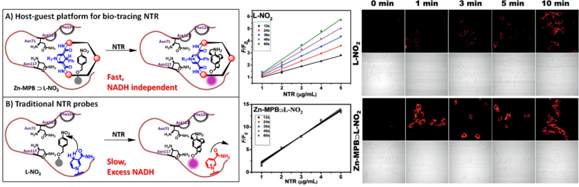 缺氧与肿瘤的各种生理活动密切相关,缺氧伴随着许多相关酶表达量上升,硝基还原酶(NTR)与缺氧的程度直接相关,定量检测硝基还原酶对于癌症的诊断具有重要的指导作用。在硝基还原酶还原底物过程中,辅酶NADH和硝基底物均参与反应,表现出双底物催化过程。现有的硝基还原酶小分子荧光探针具有较高的灵敏度,为肿瘤的检测提供依据,由于硝基还原酶酶促反应过程与NADH浓度相关,发展辅因子-底物的主-客体超分子探针,开发硝基还原酶快速检测的新方法成为研究热点。
