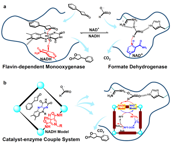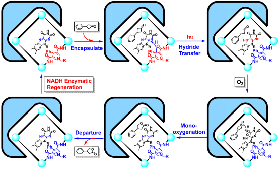 天然酶促级联反应体系仅需催化计量的辅酶便可在复杂的体系内完成高效、高选择性多步串联催化过程,是设计理想人工催化体系的最佳模型。尤其在提倡绿色发展精细化工产业的当前,仿生催化不仅能够减少精细化学品催化生产工业中大量高反应活性、高毒性氧化剂或还原剂的投入,还可以解决污染严重和反应条件苛刻等问题。辅酶在多步串联反应间的直接高效利用和动力学匹配是提升串联反应体系效率的重中之重。学习和领悟自然界酶促过程,组装金属-有机限域超分子体系,通过主客体作用协同天然酶催化是完成辅酶原位循环利用、实现持续循环串联反应的重要手段。近日,太阳成集团tyc122ccvip官网入口精细化工国家重点实验室段春迎教授团队基于前期工作基础(J. Am. Chem. Soc., 2019, 141, 12707−12716; Chem. Commun., 2019, 55, 8524−8527; Angew. Chem. Int. Ed., 2017, 56, 8692−8696; Angew. Chem. Int. Ed., 2017, 56, 15284−15288),在限域超分子拟酶催化领域取得突破性进展,提出利用辅酶基金属-有机限域超分子结构与天然酶催化体系相耦合的“套娃”式催化新策略,可直接应用于仿生催化单加氧反应。