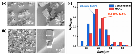 图2 晶体形貌和粒度分布对比:(a)常规溶析结晶得到的氯化钠晶体;(b)膜辅助溶析结晶得到的氯化钠晶体;(c)两种方法得到晶体的粒度分布对比图。