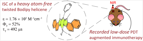 氟硼吡咯 (BODIPY) 荧光团是一个“明星”分子,由于具有良好的光物理和光化学性质,如对可见光吸收能力强、荧光量子产率高、结构易修饰等优点,得到了广泛的应用。基于BODIPY发色团的三重态光敏剂已有报道,但吸收波长较短、分子结构多样性、ISC机理也有待于进一步拓宽。最近,赵建章教授课题组和美国马萨诸塞大学医公司韩纲教授、意大利帕多瓦大学Antonio Barbon教授、德国雷根斯堡大学Bernhard Dick教授、阿卜杜拉国王科技大学Omar F. Mohammed教授等合作研究了一个具有扭曲分子结构的无重原子BODIPY分子的高效ISC能力 (三重态量子产率, FT = 52 %) 和超长三重态寿命 (tT = 492 ms),通过稳态和纳秒、亚纳秒瞬态吸收光谱详细研究了该无重原子BODIPY分子体系的光物理过程;并通过时间分辨顺磁共振波谱(TREPR)以及理论计算研究了ISC机理以及三重激发态子能级的选择性布居、以及三重态波函数的空间分布范围,从而解释了这种无重原子分子的ISC机制,其ISC主要是由具有扭曲结构的BODIPY分子的对称性降低所导致的,从而增强了自旋轨道耦合 (SOC)和ISC效率。该类光敏分子合成简单、成本低廉,由于其优异的光物理性质,可以在极低剂量的试剂浓度 (0.25 mg/kg,远低于最低临床使用剂量0.1 mg/kg,如ALA和 Photofrin) 及低光剂量 (6 J/cm2) 下即实现了高效的光动力治疗效果,将该化合物制备成纳米粒子与免疫药物联用,具有增强免疫治疗效果、协同治疗转移肿瘤的功能,并用肿瘤动物模型验证了其突出的治疗转移肿瘤的效果。因此,该类分子有望成为临床上新一代光动力治疗试剂及转移肿瘤治疗试剂。这一成果近期发表在Angew. Chem. Int. Ed. 期刊上 (Elucidation of the Intersystem Crossing Mechanism in a Helical BODIPY for Low-Dose Photodynamic Therapy. Angew. Chem. Int. Ed., 2020, 59, 16114– 16121),论文的共同第一作者是太阳成集团tyc122ccvip官网入口博士生王智佳、马萨诸塞大学医公司博士后黄灵和太阳成集团tyc122ccvip官网入口硕士生闫雨欣。