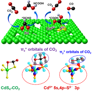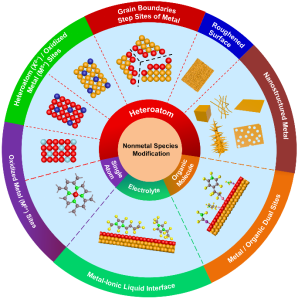 侯军刚教授等人通过液相合成的方式制备了多孔的硫改性的镉催化剂(P-Cd|S)。与未改性的Cd金属相比,P-Cd|S结构具有优异的CO选择性。通过传质模型的有限元分析,证明了硫改性的镉的高活性部分归功于多孔结构诱导的局部碱化和析氢副反应抑制。通过原位拉曼、红外和X射线光电子能谱以及理论计算,证明了双活性位点组成的共价杂化的sp带与反应中间体之间存在强相互作用,从而自然地消除了scaling relations的动力学限制,实现了产物从HCOOH到CO的转变(Adv. Energy Mater. 2020, 2002499)。基于之前的工作,侯军刚教授等人综述了近年来对纳米催化剂的非金属物种修饰的研究进展,着重详述了基于非金属物种的调控策略,包括杂原子引入,有机分子修饰,电解液工程以及单原子工程。结合实验、原位表征和理论计算,归纳出了非金属物种改性对于构建独特的活性中心,克服二氧化碳还原的动力学限制具有重要意义(Adv. Energy Mater. 2020, 10, 2000588)。这系列工作对于电催化二氧化碳还原反应的选择性调控提出了深刻的见解,有助于加速推进绿色碳循环的机理研究及实际应用。