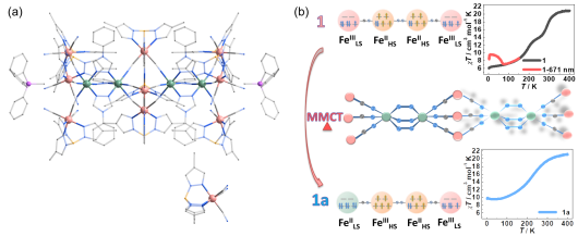 近年来,具有可调控电子态的功能分子材料逐渐成为配位化学、材料科学和物理等领域的研究热点之一。自旋交叉(SCO)和电子转移(MMCT)可以在外界光热等物理刺激下发生价态和自旋态的可逆转变,表现出自旋双稳态特性,有望应用于高密度信息存储、自旋电子器件、分子开关和传感材料。自旋交叉过程表现为单个金属中心高低自旋态的变化,而电荷转移发生在多个金属中心之间在伴随金属价态改变的同时,还会发生自旋态的变化。因此,金属间电荷转移过程有可能诱导新的自旋交叉位点产生,实现二者的协同调控。然而,自旋交叉和电荷转移均表现出对配位环境改变的敏感性,如何将二者的特性相结合共同调控电子态极具挑战性。