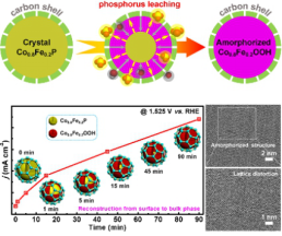在此基础上,他们提出了一种磷物种促进的深度电化学氧化策略,构筑了碳包覆非晶钴铁羟基氧化物。发现,非晶态结构的演变对磷物种浸析具有超强“依赖”,高表面能空位和缺陷位会在磷浸析过程中形成,驱使残留物种发生结构重组,并在电氧化条件下进一步氧化,形成具有非晶态结构的钴铁羟基氧化物。随电氧化驱动磷浸析持续进行,非晶构型逐渐由表层深入至体相,最终形成全体相的非晶态结构。系列成果发表在Small Methods(2020, DOI:10.1002/smtd.202000546)和Nano Energy(2020, 69, 104377)上。