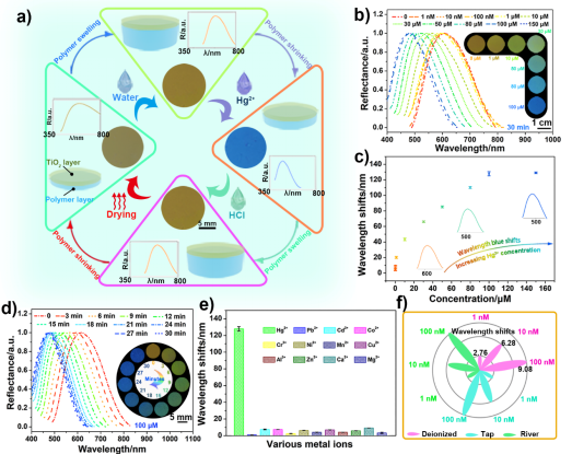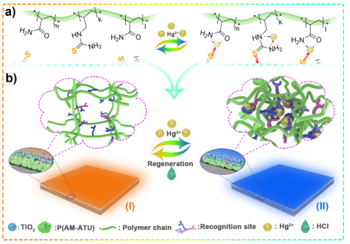智能光子晶体由含硫脲官能基的聚合物纳米粒子P(AM-ATU)和高折光指数的纳米氧化钛交替堆叠而成,其结构中含有丰富的汞离子识别位点,通过配位键合,选择性捕获水环境中的汞离子。基于纳米粒子形成的结构孔隙,使被检测物快速渗透、扩散、吸附到作用位点,加速传感。研制的光子晶体对汞离子的响应灵敏度高,检测限可达1 nM,且对汞离子具有特异性识别能力。设计了时间分辨检测方法,实现1 nM - 800 μM的宽范围检测,且可逆性和重现性优异。研究中所选取的不同水源对汞离子测试几乎无干扰。循环吸附测试显示,光子晶体薄膜具有良好的循环再生性能。当水环境中汞离子初始浓度低于20 μM时,汞离子吸附平衡后去除率超过90.0%。该光子晶体膜对汞离子的最大平衡吸附量可达739.6 mg·g-1。研究采用耗散型石英晶体微天平实时监测了薄膜在汞离子吸附过程中的质量和粘弹性变化,揭示了基于纳米聚合物的两阶段汞离子吸附过程原理。该工作得到了国家自然科学基金、兴辽人才计划、中央高校基本科研业务费的大力支持。