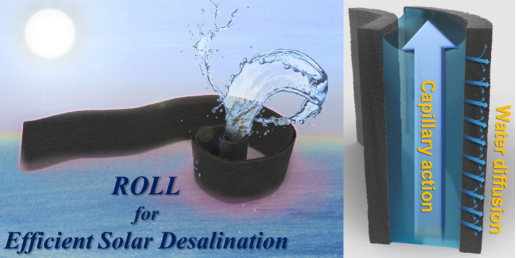 图1. 卷状光热蒸发器海水淡化应用及其导水作用示意图。
