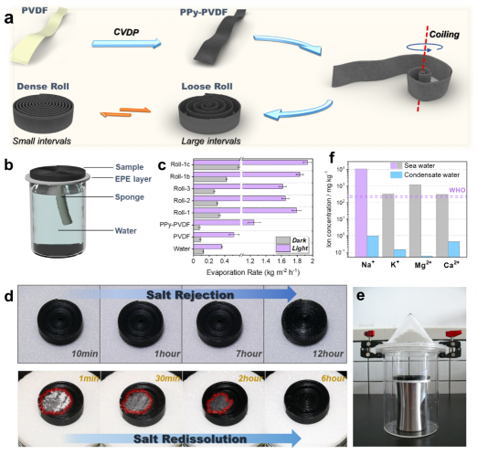 图2. a卷状光热蒸发器制备示意图;b蒸发装置示意图;c卷状光热蒸发器的蒸发速率对比;d拒盐性能测试;e海水淡化测试中蒸发-冷凝装置照片;f海水及冷凝水样中常见阳离子浓度。