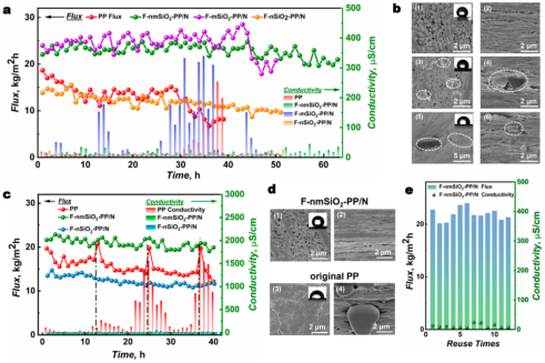 高盐水(3.5wt%)MD测试表明F-nmSiO2-PP/N渗透通量达到22.0 kg/(m2·h),且连续运行后F-nmSiO2-PP/N表面无明显结晶沉积(图2a, b)。研究还发现,F-nmSiO2-PP/N表面非常坚韧,能够在长时间超高盐浓度(15 wt%)连续运行、间歇式不清洗运行等严苛条件下保证通量稳定,抗污染性能优异(图2c-e)。