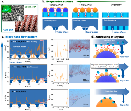 项目团队研制的F-nmSiO2-PP/N膜,表面微、纳多级结构与疏水基团,显著增加膜界面的粗糙度和疏水性,并利用道南效应,实现对氯离子的排斥;同时,F-nmSiO2-PP/N膜表面微米级超疏水结构呈现半球状类似荷叶表面的规则突起,保留更多气隙,显著增大有效蒸发面积和渗透通量(图1b)。另一方面,纳米尺度的连续突起结构,在界面构建了纳米级的微湍流,显著增强复合膜界面流体湍动程度;CFD模拟结果表明,膜表面所形成的纳米级旋涡可以有效地缩短盐离子与膜表面相互作用的局部停留时间,减少晶体沉积(图1c,d)。
