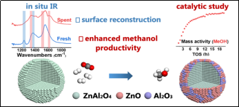 除了体相的晶相转变,催化剂的表面重构与催化活性和产物选择性的变化同样密切相关。郭新闻教授团队采用CO2探针-原位红外、HAADF-STEM等多种表征技术及动力学实验,发现在CO2加氢制甲醇反应中,ZnAl2O4尖晶石催化剂表面Zn-O-Al结构消失、形成高活性的无定型ZnO物种,显著提高甲醇生成速率(TOF值)和甲醇选择性。该工作对理解反应中催化剂表面重构下的动态构效关系、开发高效甲醇合成催化剂带来了启发,研究成果发表在Applied Catalysis B: Environmental 2021, 284, 119700.