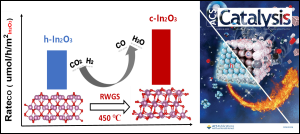 晶相结构同样显著影响催化反应性能。郭新闻教授团队采用实验结合密度泛函理论计算的方法,对不同晶相氧化铟催化CO2加氢制CO的性能差异进行了深入研究,发现六方相和立方相氧化铟表面生成催化活性位点的能力及对CO2吸附活化的差异是影响催化性能的根本原因。团队通过原位XRD等技术观察到六方相氧化铟在催化反应条件下转变为立方相,并探讨了晶相转变的机理,为深入理解、优化设计In2O3催化CO2加氢体系提供了新的思路。该工作以封面论文形式发表在ACS Catalysis. 2020, 10, 3264-3273。