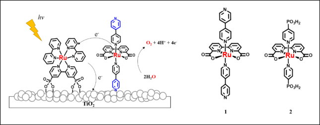 由孙立成院士团队研发的(bda = 2,2′-联吡啶-6,6′-二羧酸)类催化剂是目前最高效的一类分子水氧化催化剂,Ru-bda凭借其低过电位和制备简单等优势,在人工光合成分解水反应中得到越来越广泛的应用。分子水氧化催化剂的创始人、人工光合作用领域国际权威专家、美国科公司院士Thomas J. Meyer教授(北卡罗来纳大学教堂山分校)最近将该类催化剂誉为“Sun catalyst”(Trends in Chemistry 2021, DOI:10.1016/j.trechm.2020.11.002)。之前,我们对“Sun catalyst”在均相体系中模拟自然界产氧酶功能以及O-O键形成机制进行了系统的研究,但对于负载这类催化剂的全分解水器件如染料敏化光电化学池(DSPEC)所涉及的杂化界面性质了解较少。为此,精细化工国家重点实验室李斐教授和Thomas J. Meyer教授合作,首次揭示了锚定基团对于修饰“Sun catalyst”的光阳极催化水氧化性能的影响。