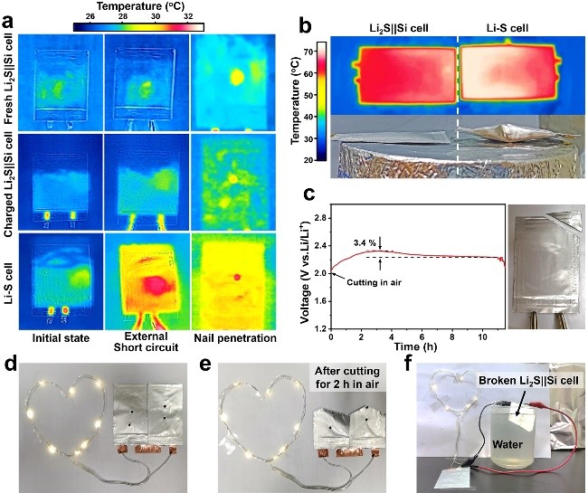 图1. 基于硫化锂正极、硅负极与聚合物凝胶电解质的准固态锂二次电池在(a)内、外部短路、(b)过热、(c)剪切后空气静置、(d)穿刺、(e)剪切暴露空气、(f)剪切浸水等滥用条件下的安全性评估