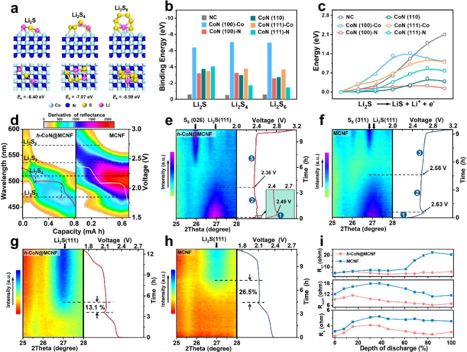 图2.导电吸附-催化双功能活性位点对锂硫可逆氧化还原反应促进机制的原位表征