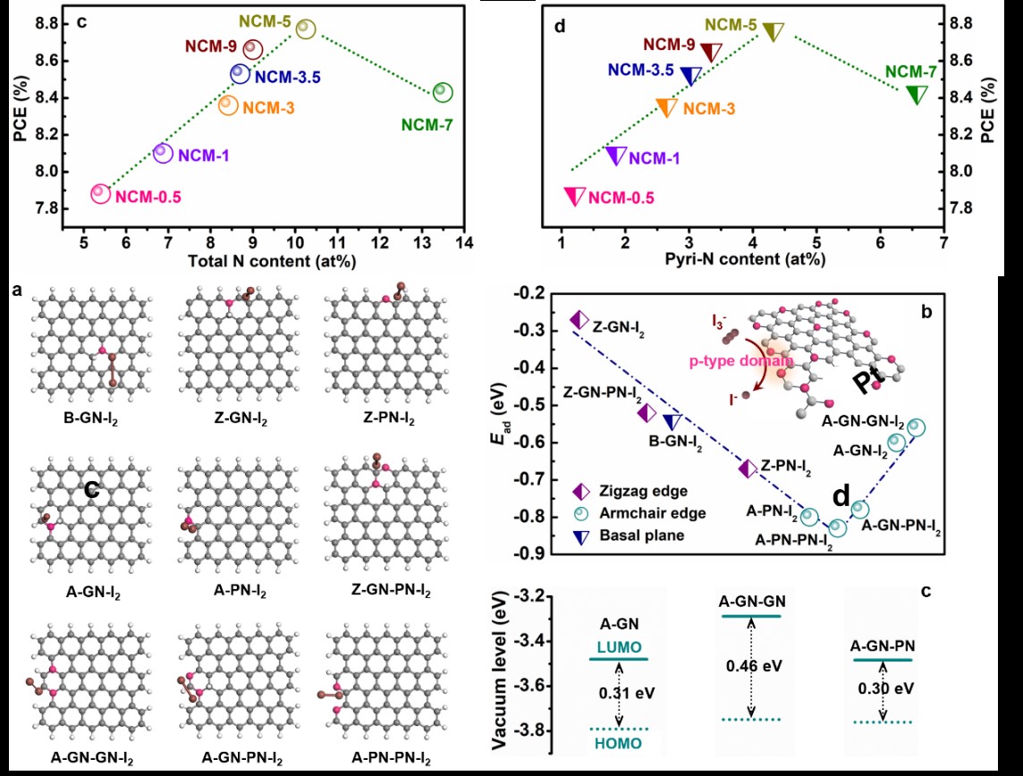 作者以不同氮掺杂的碳材料(NCM-x)为催化剂,碘三还原反应为探针,结合DFT计算,研究了高氮掺杂的功能碳材料的电催化性能之本征构效关系。结果表明,相对于石墨氮,吡啶氮能够显著降低带隙,促进反应中间产物碘分子的吸附,高吡啶氮掺杂的碳材料显示出更加优异的催化活性。这一工作为高氮掺杂碳材料的制备提供了一种新的策略,亦为其他非碳杂原子的高掺杂提供了新思路。