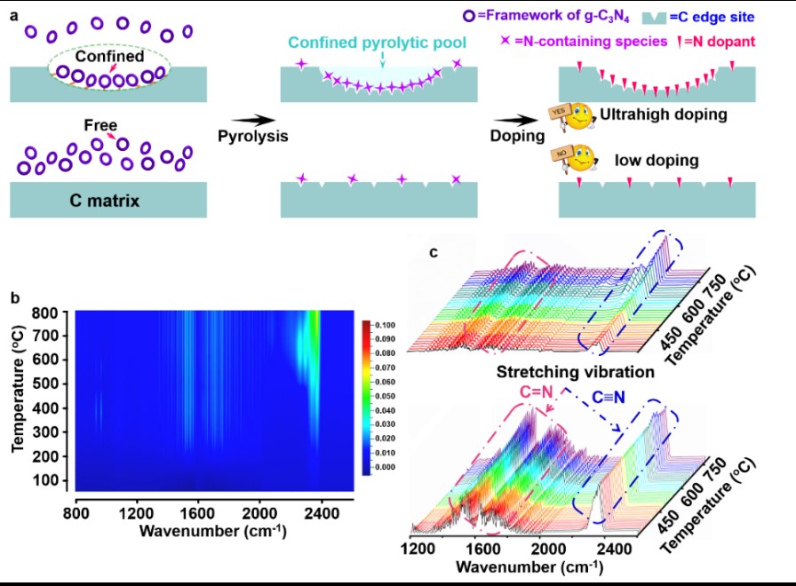 作者利用热重-红外-质谱(TG-IR-MAS)技术,研究揭示了有/无2-巯基苯并咪唑情况下g-C3N4的热解行为。发现, C-S-C键诱导的限域热解能够显著提高g-C3N4的热稳定性,证实了前驱体中的氮源被原位高效转化利用,这是实现高效氮掺杂的本征原因。