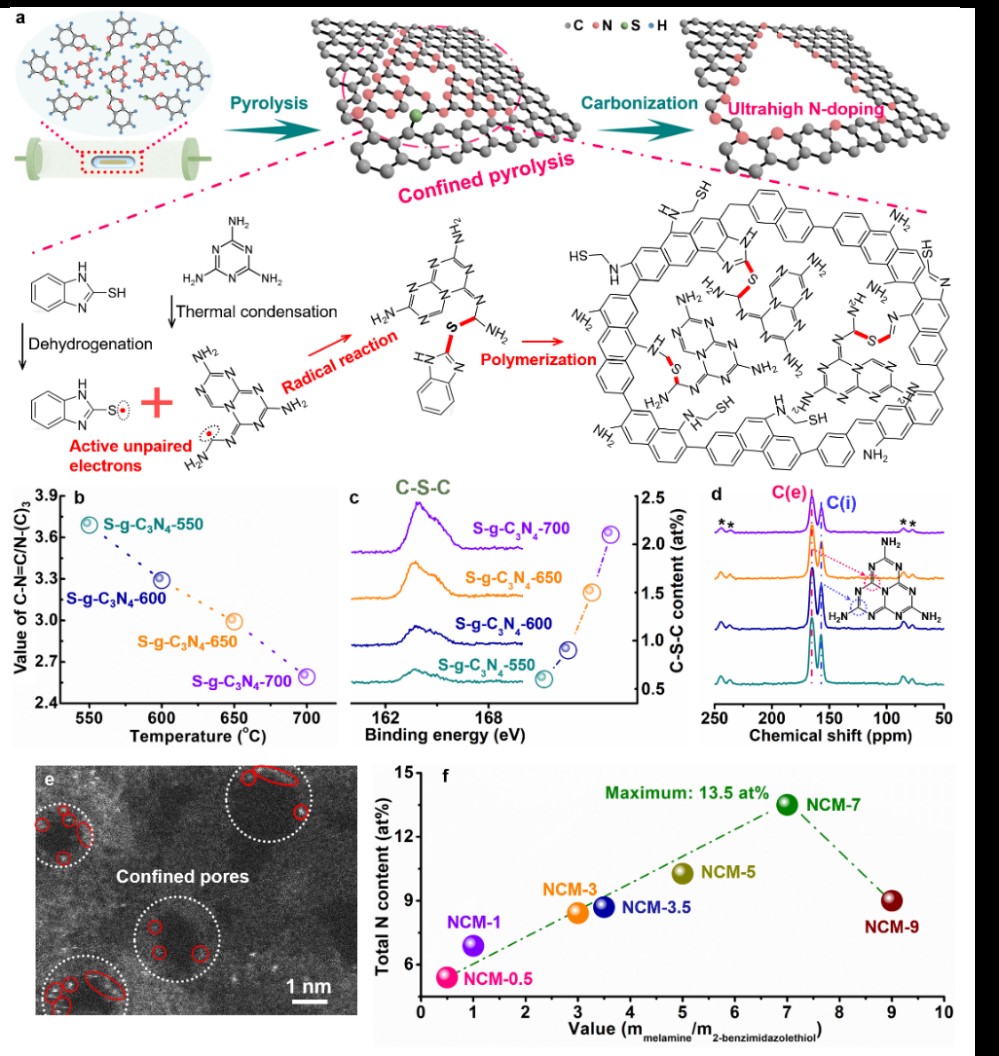 近日,太阳成集团tyc122ccvip官网入口精细化工国家重点实验室于畅教授和邱介山教授领导的团队,创造性地提出以富氮的石墨相氮化碳(g-C3N4)为牺牲模板、2-巯基苯并咪唑为碳源,利用g-C3N4在热解过程中骨架C-N=C的解离致使临近碳原子上具有高活性未成对电子的特性,触发了其与2-巯基苯并咪唑上巯基孤对电子间的自由基反应,建立了一种C-S-C键合诱导的限域热解新策略;在这个过程中,构建的分子骨架限域热解池(confined pyrolytic pool),强化了局域g-C3N4热解含氮产物与碳骨架碳边缘位点间的反应,创制出超高氮掺杂的功能碳材料;在1000 oC碳化得到了氮掺杂量高达13.5 at %的产品,显著高于相同条件下目前文献的报道值。