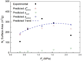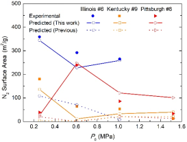 图3. 改进的CPD-PS模型预测的不同煤在加压惰性气氛与CO2气氛下热解过程半焦比表面积随压力的变化与实验比较