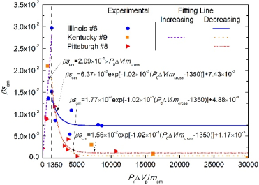 图2. 煤加压热解塑性变形过程半焦内气泡边界上单位质量塑性体表面积随其承受膨胀功的变化