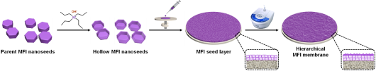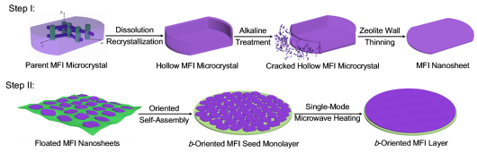 高长径比的二维沸石纳米片因其显著降低的扩散路径,较高比表面积及表面活性,在吸附、催化和分离等研究领域引起了广泛关注。其中,以MFI沸石纳米片为基本构筑单元制备超薄取向分子筛膜具有较好的工业应用前景,但简易、快速制备结构完整、尺寸均一的高长径比MFI沸石纳米片仍是一项富有挑战性的工作。除此以外,在MFI超薄膜构筑过程中,取向纳米片晶种单层的制备以及面内外延生长的精确调控也是亟待解决的难题。