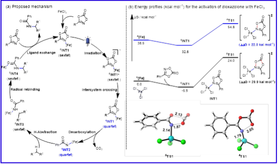 该工作以简单的铁盐为催化剂,在可见光诱导下成功实现了基于二噁唑酮分子的乃春转移反应。该反应无需加入额外的光敏剂或者配体,反应条件温和,且具有良好的底物适用性。以分子间的C(sp3)–N的构筑为例,给出了可能的反应机理:首先,基态的铁催化剂(六线态)与二噁唑酮分子配位,生成中间体6INT1,在可见光的照射下,该物种被激发并通过系间窜跃过程生成四线态的4INT1,随后脱除CO2得到酰基乃春铁中间体4INT2。最后,4INT2经由连续的分子间的氢原子转移(HAA)、自由基重组、配体交换过程得到目标产物并再生催化剂,开启下一催化循环。