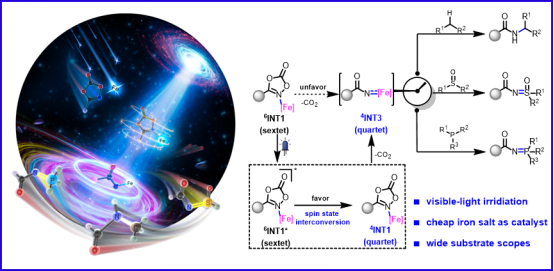 “选择性分子转换和官能化”研究团队长期致力于分子的选择性转换方法学研究,并已取得系列创新成果。该论文结合理论计算及机理探究实验,揭示了通过可见光调控铁-二噁唑酮物种自旋态的改变(六线态到四线态的转变)降低二噁唑酮分子脱除二氧化碳时的活化能,进而实现在温和条件下对二噁唑酮分子的活化转化。这一工作将传统的过渡金属催化与可见光催化相融合,为可见光与廉价金属协同催化体系的构建提供了新的思路。