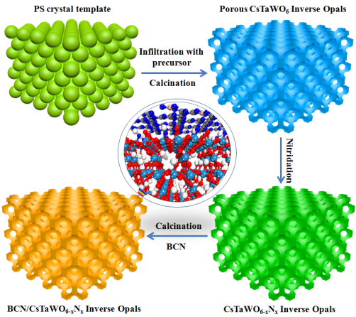 (1) 首次合成了在FTO基底上生长的三维有序大孔反蛋白石结构(3DOM) CsTaWO6-xNx阵列,然后形成了超薄的硼掺杂氮化碳均匀插层3DOM CsTaWO6-xNx反蛋白石结构异质结阵列(BCN/CsTaWO6-xNx)。