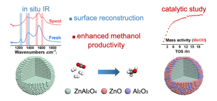 Zn基氧化物作为高效的高温CO2加氢制甲醇催化剂,已被广泛用于构筑氧化物-沸石双功能催化剂,选择性催化CO2加氢合成烃类化学品。但高温条件下的表面结构表征仍然存在很大挑战。因此,鉴定反应条件下的Zn基氧化物表面结构对于理解构-效关系、设计合成高性能甲醇合成催化剂至关重要。郭新闻教授团队在研究中发现ZnAl2O4在CO2加氢反应中存在明显的诱导期,结合XRD, STEM,in situ FTIR和Raman等表征结果显示ZnAl2O4在反应过程中表面发生了重构。深度分析显示还原性气氛可诱导ZnAl2O4表面发生相分离,生成无定形氧化锌。在反应气氛中,H2负责打断ZnAl2O4尖晶石表面的Zn-O键以及促进表面氧空位的生成,CO2氧化部分还原的ZnAl2O4尖晶石表面,氧化还原循环破坏了ZnAl2O4尖晶石表面结构,使其表面发出重构产生具有甲醇生成活性的无定形ZnO相。结合动力学分析表明重构表面形成的无定形ZnO通过加速H2的活化促进了甲醇的合成。该研究为理解锌基催化剂的表面结构和构效关系提供了新的见解。该研究成果发表在Applied Catalysis B: Environmental 2021, 284, 119700。