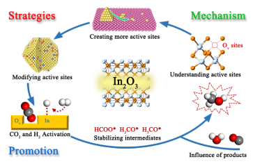 In2O3由于比ZnO更易被还原形成氧空位(活性位),其表面独特的活性位结构在中低温区间表现出优异的甲醇选择性,并由此引发了In2O3催化CO2加氢制甲醇的研究热潮。郭新闻教授团队凭借多年CO2催化转化的研究认识,从活性位点结构和反应机理从发,对In2O3催化CO2加氢制甲醇催化剂性能改进策略进行了系统地归纳讨论。该综述立足于氧空位作为活性位点及甲酸盐路径在该反应过程中的重要作用,将提升In2O3催化CO2加氢制甲醇性能的主要手段归纳为五个方面:1,增加活性位点数量,即通过引入载体提高In2O3的分散度、加快H2活化促进氧空位形成等方式增加活性位点数目;2,促进H2的活化,即通过负载零价过渡金属的方式促进H2的解离活化(如Pd, Pt),在加快活性位点形成的同时促进CO2和反应中间体的后续加氢过程;3,促进CO2的吸附活化,即通过引入ZrO2助剂、调节In2O3晶体结构等方式增强CO2的吸附活化;4,稳定关键反应中间体,即通过构建In2O3-ZrO2等界面对甲酸盐路径中的反应中间体进行稳定;5,引入新的活性位点,即通过形成In-M(M=Pd, Ni等)合金相,提升其固有催化性能并与In2O3之间产生协同作用提升其催化性能。此外本文还讨论了反应产物(CO和H2O)对催化进程的影响,并对In2O3双功能催化体系进行了拓展讨论。最后对In2O3催化体系目前的研究重点、待解决问题和发展方向进行了讨论与展望,为In基催化剂的理解和发展提供了系统的归纳梳理和指导意见。该综述发表在ACS Catalsis. 2021, 11, 1406。