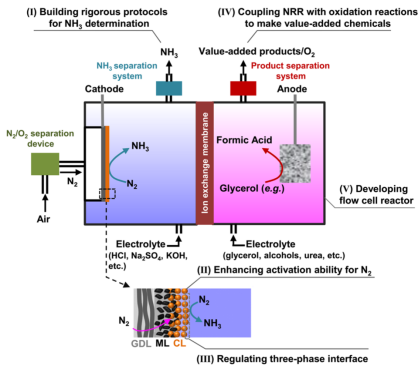 总之,尽管NRR的选择性和产率已有不同程度的提升,但距实际推广应用还有很长的路要走。首先,研究者需要严格按照文献报道的可靠方法进行氨产物的分析定量,这是评价和筛选催化剂性能的先决条件;特别是在催化剂氨产率小于10 nmol s−1 cm−2时,15N2同位素标记定量实验应该是必不可少的。本文作者建议并呼吁研究人员用NH3分电流密度、质量/面积归一化的产率作为NRR反应的描述符。其次,要重视并着力提升催化剂的N2活化能力,这能有效提升NRR的本征反应速率。此外,要采用原位红外、原位拉曼等技术,探究并解耦电极-电解液界面反应之本质。研究并创建高附加值产物的阳极反应,取代析氧反应,也是提升整个反应能源效率的重要发展方向。最后,本文作者建议进一步加强对流动池反应器和相关工艺技术的研发,切实推进电化学合成氨技术路线的实际应用。