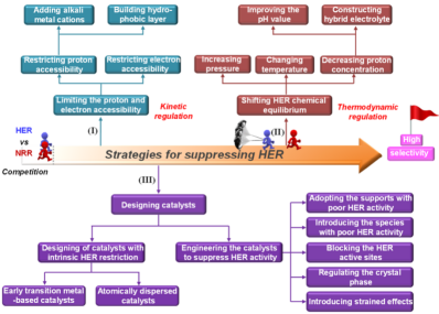 氨是化肥生产工业的重要原料,也是一种能源载体。目前,氨的合成主要采用传统能源密集型的Haber−Bosch法。最近,凭借节能与环境友好等优势,电催化氮气还原反应(NRR)合成氨路线在国内外受到广泛关注。然而,该技术路线需要克服的瓶颈性难题之一,是如何摆脱析氢(HER)副反应的限制,同时,需要总结凝练并形成能够有效提升NRR选择性的实验操作指南。NRR是一个复杂的反应体系,涉及气-液-固三相界面微环境与质子、多电子转移,从基本的反应机理解析入手,聚焦于反应动力学、热力学以及催化剂设计等层面,深度解耦抑制HER的方法策略尤为重要。