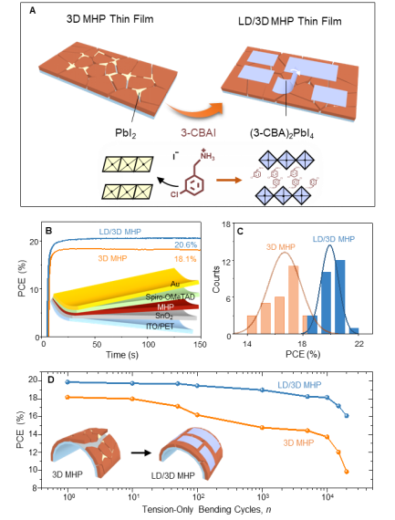 研究团队通过在3D钙钛矿表面和晶界原位形成低维(LD)钙钛矿,构筑出了一种新型LD/3D结构。该结构中,LD钙钛矿一方面能够有效钝化深能级缺陷并减少电荷复合,显著提升了器件光电转换效率(21%,目前柔性PSCs最高效率之一)和长期稳定性(光照下持续工作800小时仍维持最初效率的90%);另一方面,LD钙钛矿的存在提高了薄膜的断裂能,有效提升了器件耐弯折性(连续弯折20000次仍维持最初效率的80%)。基于以上新策略,柔性PSCs光电转换效率、工作稳定性与机械稳定性(耐弯折性)获得了同时提升,这为柔性PSCs技术的发展以及未来商业化应用提供了有力支撑。