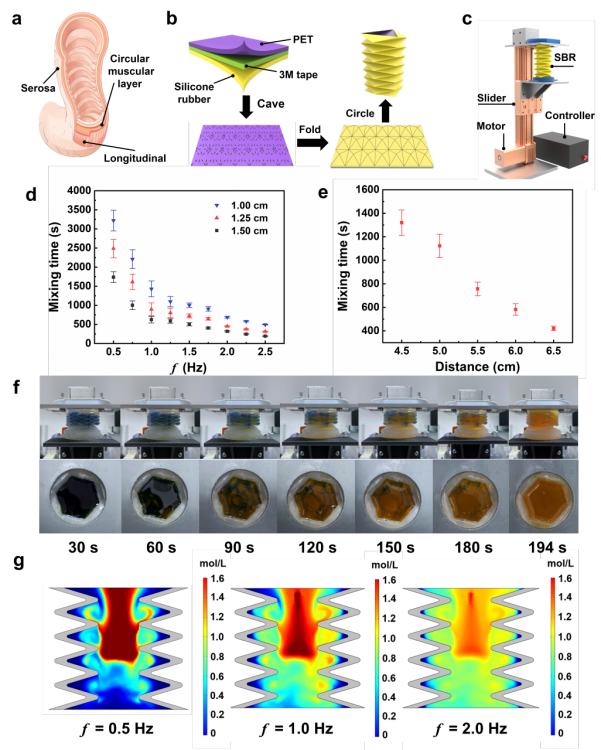图2. (a-c)SBR的设计与制造;(d-f)SBR的部分性能测试;(g)利用有限元分析法探究SBR混合机理的部分模拟结果。