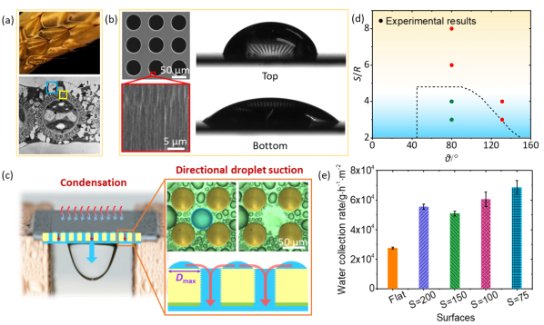 图2. a. 湿润的苔藓紫罗兰及其细胞壁结构;b. 仿生表面RIPS形貌及润湿性表征; c. RIPS定向抽吸的宏观、微观可视化表征及工作原理示意图;d. RIPS设计的关键参数与凝液抽吸性能关系的相图;e. RIPS冷凝集水性能