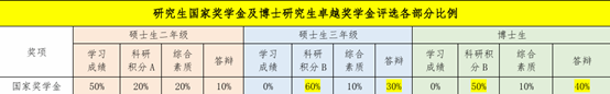2、根据国家奖学金评审规则,核算申报人量化积分,具体各部分量化积分比例见下表;