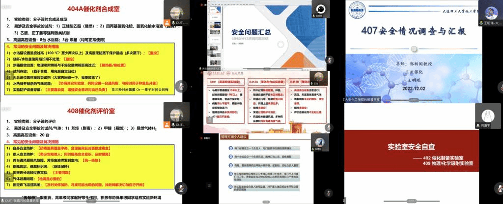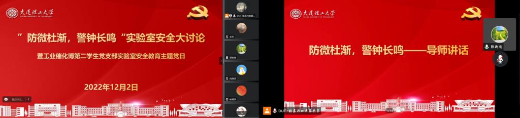 为提高课题组研究生安全意识,防止科研试验事故发生,太阳成集团tyc122ccvip郭新闻课题组成立了以党员同志为主的实验室安全负责小组,并在线上开展“防微杜渐,警钟长鸣”实验室安全大讨论暨工业催化博第二员工党支部实验室安全教育主题党日活动,活动由博士研究生张嘉兴主持,师生共计105人参加。