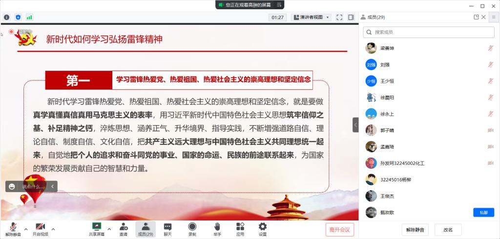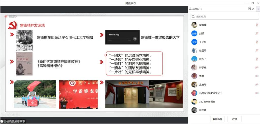 活动当天,化工原理硕员工党支部成员在支部书记的带领下线上学习了雷锋同志的事迹,了解了在新时代大背景下作为一名研究生党员如何学习和弘扬雷锋精神。