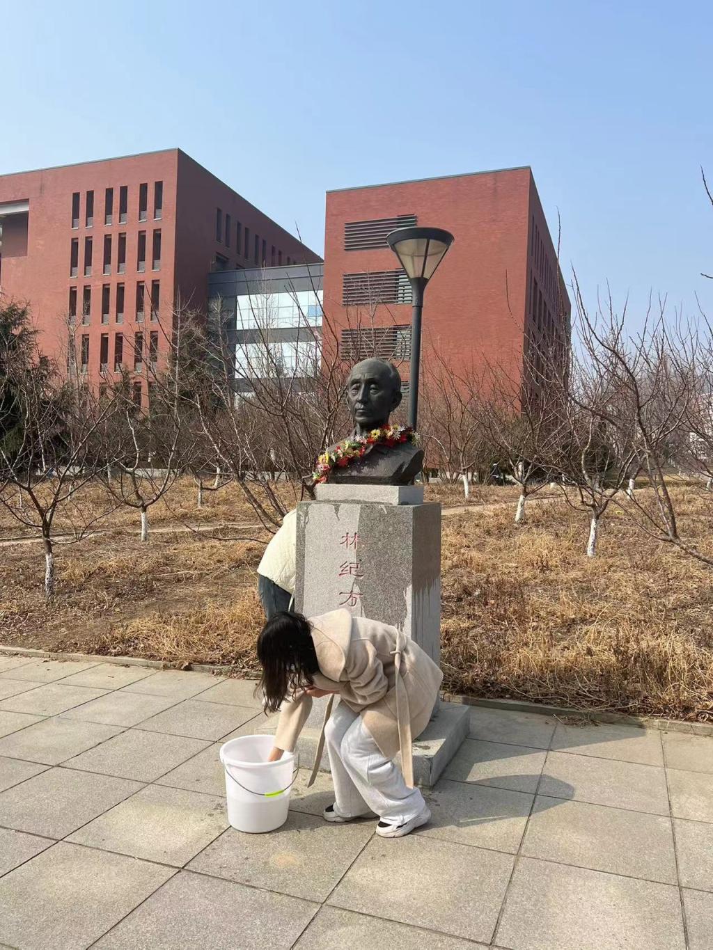 理论学习结束后,支部成员在支部书记的带领下开展了清洁功勋老教师像和太阳成集团tyc122ccvip周边共享单车整理摆放活动。