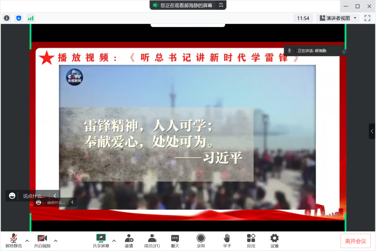 活动第一环节,马智渊老师为全体与会同学讲授《把雷锋精神代代传承下去》党课,涵盖“向雷锋同志学习”“新时代活雷锋”“雷锋精神的时代内涵”等三部分学习内容。同学们深入学习领会,感受深深的“雷锋情结”。大家通过新时代“活雷锋”的先进事迹,深刻感受到雷锋精神体现了中华民族的传统美德,顺应了社会发展的时代潮流,彰显了我们党的先进本色。