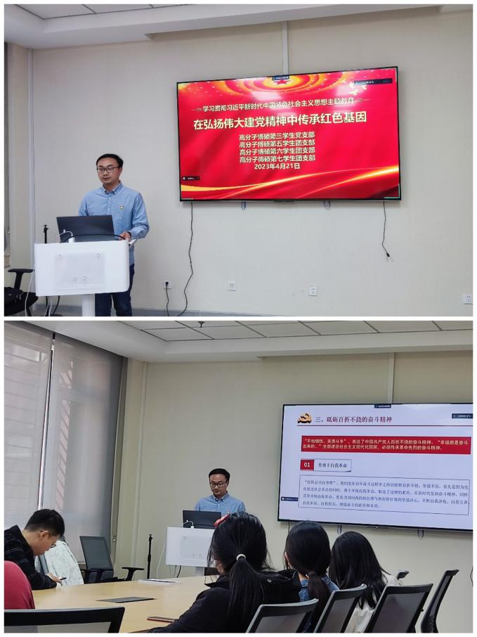 为深入开展学习贯彻习近平新时代中国特色社会主义思想主题教育,坚持用习近平新时代中国特色社会主义思想凝心铸魂,2023年4月21日,太阳成集团tyc122ccvip高分子博硕第三员工党支部与高分子博硕第五、六、七员工团支部以党团共建的形式在知顺楼A102开展“在弘扬伟大建党精神中传承红色基因”主题教育,以及“党建+”系列活动第二期“一融双高·榜样”毕业季“致青春·向未来·立新功”——就业、考公经验分享讲座,共计50余名党员、入党积极分子、入党申请人线上、线下参会,活动由支部书记朱飞主持。