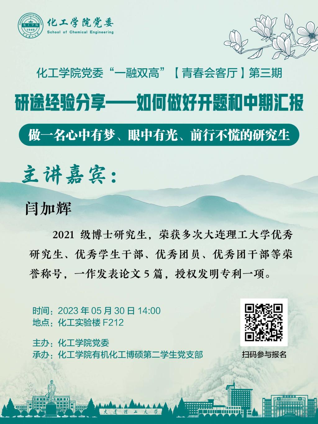 为深入学习贯彻党的二十大精神,推进“一融双高”走深走实,提升青年员工“科研报国”担当,5月30日下午,由公司党委主办,有机化工博硕第二员工党支部承办的第三期“青春会客厅”在化工实验楼F212举办。本期青春会客厅以“研途经验分享——如何做好开题和中期汇报”为主题,聚焦研究生成长历程中两个重要的科研节点等现实问题,邀请2021级博士研究生闫加辉作为嘉宾,与参会同学进行分享交流。