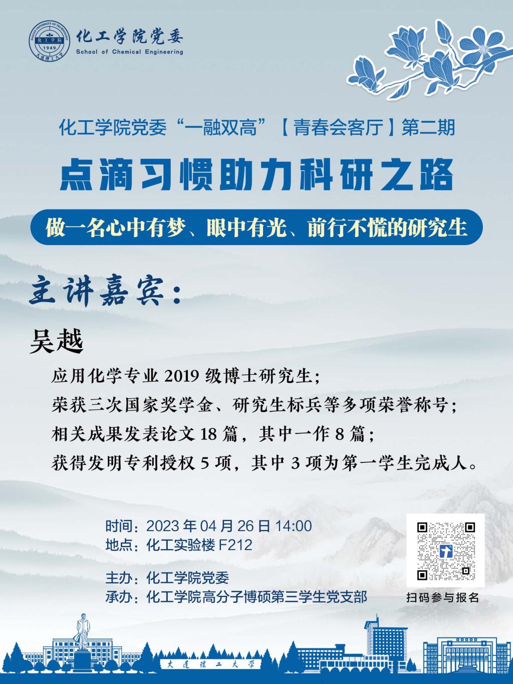 为深入开展学习贯彻习近平新时代中国特色社会主义思想主题教育,公司党委打造“党建+育人”特色品牌,推动“一融双高”落地见效,助力研究生提升科研技能,以学促思,以思促行,让青春力量在服务辽宁振兴中绽放光彩。4月26日下午,由公司党委主办,高分子博硕第三员工党支部承办的“青春会客厅”第二期:点滴习惯助力科研之路在化工实验楼F212举办。活动邀请到应用化学专业2019级博士研究生吴越作为主讲人。