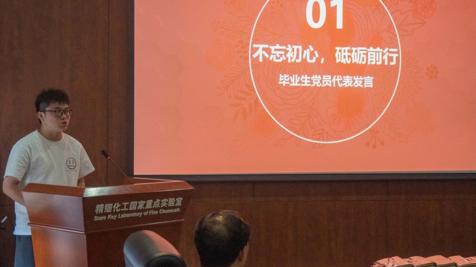 接着,由毕业生党员代表耿建琪同志发言。作为上一届党支部副书记,耿建琪回忆了自己与老师和同学们一起学习成长、组织支部工作的点滴过往,表达了感谢之情,及对公司的美好祝愿,并代表毕业生党员庄严承诺,走向工作岗位也将始终牢记“共产党员”的第一身份、始终牢记“强国有我”的使命担当。