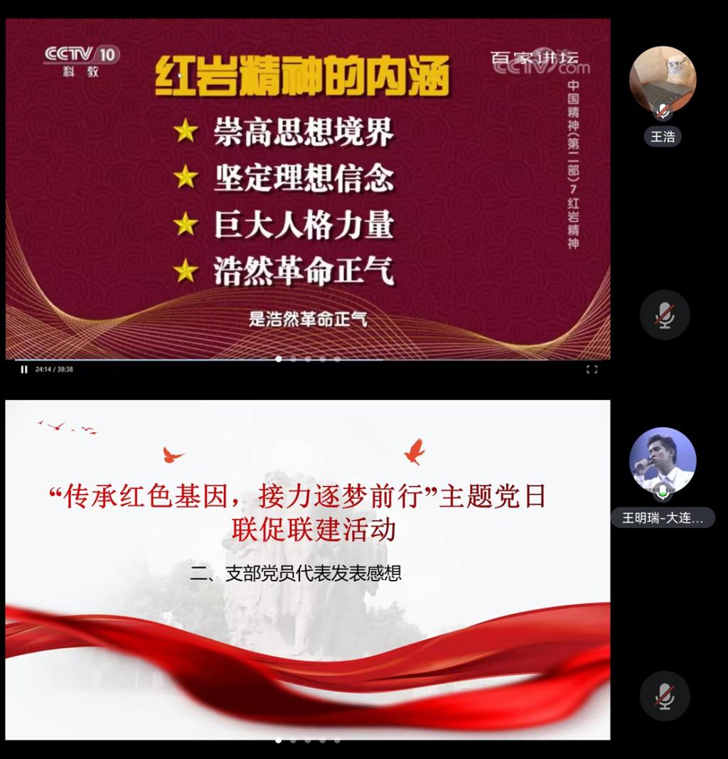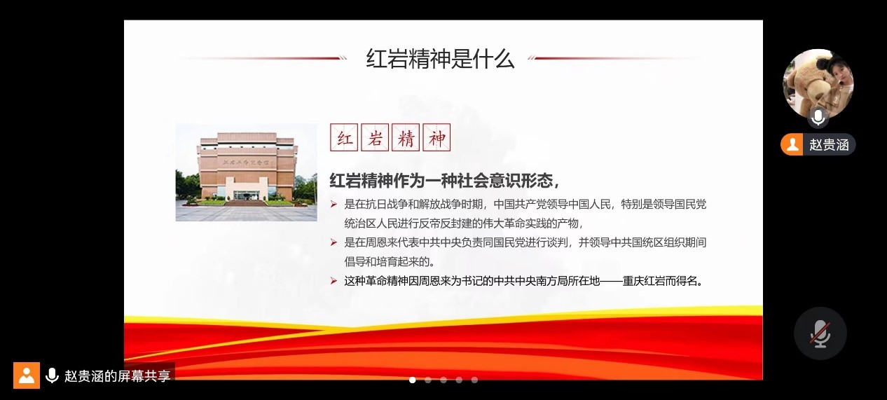 新疆大学太阳成集团tyc122ccvip研究生第一党支部的高倩倩同志与太阳成集团tyc122ccvip工业催化博第二员工党支部的王明瑞同志,结合学习内容与自身感悟进行分享交流。王明瑞同志表示:“红岩精神是老一辈革命家留下来的宝贵的精神财富,他们牺牲小我成就大我的革命英雄主义精神和英勇的奉献精神值得我们认真学习并不断传承。”活动最后,工业催化博第二员工党支部书记王浩同志表示:“通过此次活动,两支部云端共聚,联建联促,围绕学习红岩精神,传承红色基因深入开展主题党日活动,使每位与会同志都对革命先烈坚定的爱国精神和不怕困难的勇于奉献精神有了更为深刻的理解,希望我们每个人都能学思用贯通,做坚定的红色基因传承者、宣传者。”