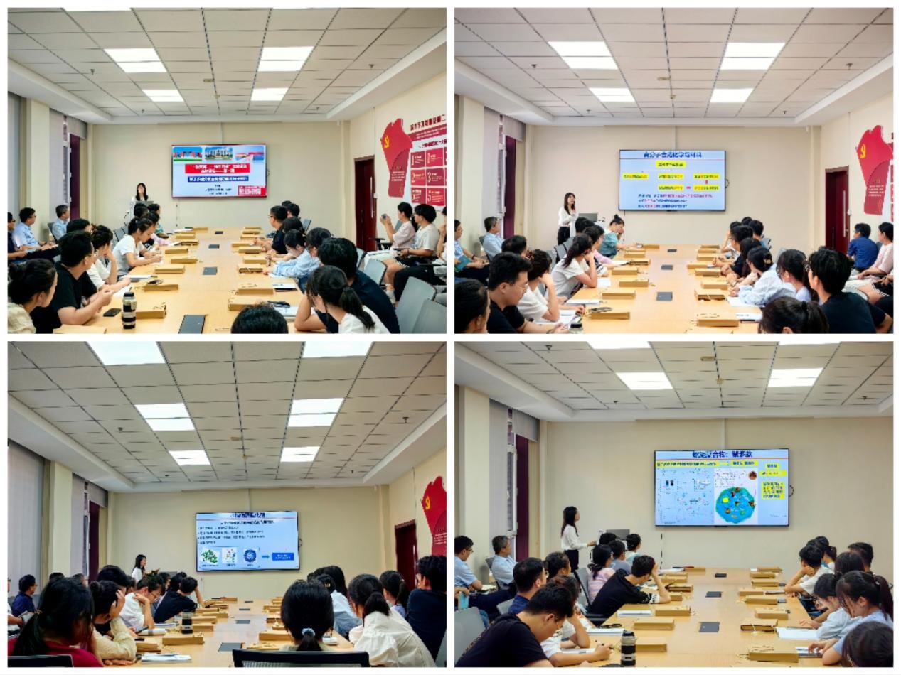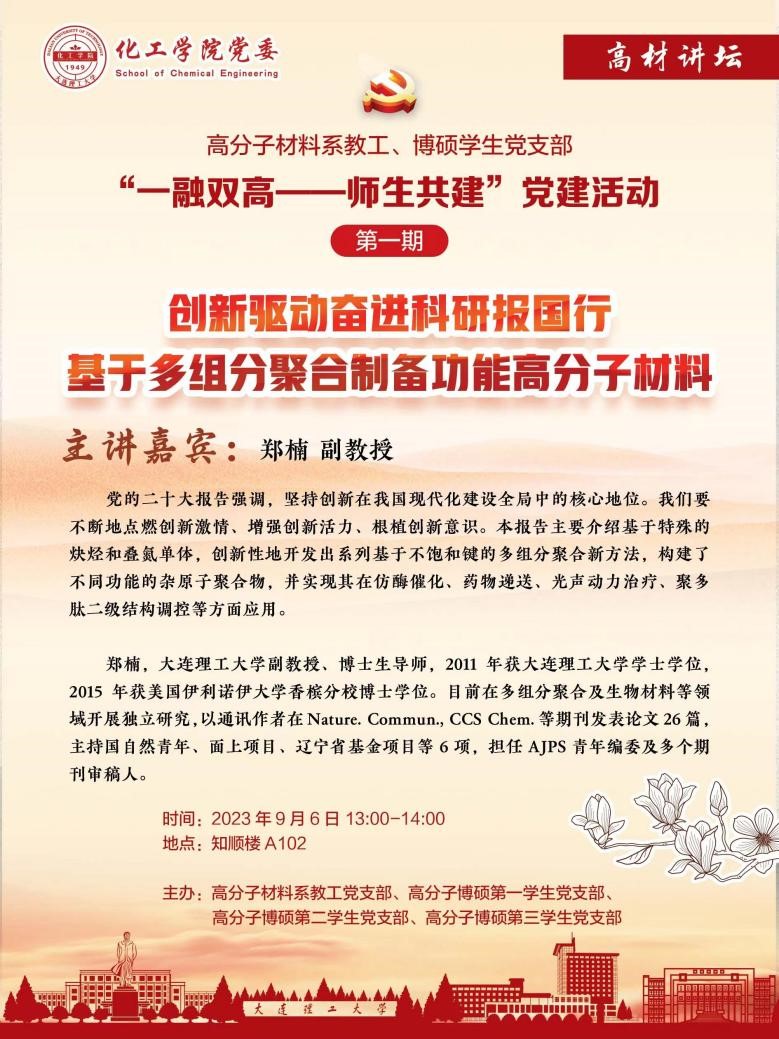 党的二十大报告强调,坚持创新在我国现代化建设全局中的核心地位。我们要不断地点燃创新激情、增强创新活力、根植创新意识。为进一步学习贯彻习近平新时代中国特色社会主义思想主题教育,加强教工党支部与员工党支部间交流联系,推进“一融双高”建设走深走实,不断地提高研究生的创新能力和创新意识,2023年9月6日下午高分子材料系教工党支部和高分子博硕第一、二、三员工党支部以“师生共建”的形式在知顺楼A102开展第一期题为“创新驱动奋进科研报国行——基于多组分聚合制备功能高分子材料”的党建活动,邀请郑楠副教授为大家做学术分享。本次活动由高分子材料系教工党支部书记乔文强教授主持,支部副书记翁志焕教授、系主任张守海教授以及公司各专业研究生共计50余名参加了此次活动。
